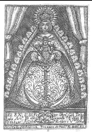 El grabado más antiguo. de los conocidos hasta ahora, es el que se reproduce por primera vez en el cartel anunciador de estas jornadas, recientemente adquirido por el Centro de Estudios Rocieros de Almonte (fig. 2). La Virgen, sobre fondo oscuro, entre cortinones recogidos, aparece vestida con saya bordada, con lazos en una franja central, manto de mangas perdidas, toca de papos, festoneado todo su perfil por una serie de doce semicírculos de encajes por cada lado. Luce corona de rayos agudos y flameantes, media luna y cetro. El Niño viste de rey, con el orbe en una mano, mientras bendice con la diestra. La línea semicircular que cierra la imagen por su base, y que será constante en las posteriores estampas, es un recurso para interpretar en perspectiva la falda cónica. El basamento cuadrado, decorado con un elemento vegetal al centro, sirve para situar una inscripción en que se lee: «El EXº Sr. Dn. Felipe Anº. Gil Taboada Arcº. Seuª. Concedio 40 días Yndulugeª . A Quien Rezare Vna Salue delante La milagrosa. Ymagen. de N. S.ª L ROCIO». Desarrolladas las abreviaturas, dice: «El Excelentísimo Señor Don Felipe Antonio Gil Taboada, Arçobispo de Seuilla, concedió 40 días de yndulgencia a quien rezare vna salve delante de la milagrosa ymagen de Nuestra Señora del Rocío». Aunque no tiene firma, la referencia al arzobispo Gil Taboada obliga a situarlo a partir de los años 1720-1722(21), pero no después de 1754, fecha en que otra calcografía afirma que goza de indulgencias concedidas por tres señores obispos.