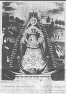 Reseñemos aquella estampa (fig. 12) en la que la Virgen aparece sobre unas nubes, y a cuyo pie se abre un óvalo con la ermita y el ambiente festivo de la romería, con carretas engalanadas. Dice así: «Vº. RTO. DE MARIA SSMA. DEL ROCIO cuya efigie se venera en su Hermita de la Villa de Almonte, ante la que rezando una Salve se ganan 420 días de indulgencias concedidas por varios SS. Arzobispos y Obispos»(39). Como puede comprobarse, tanto el texto como la iconografía de la Virgen continúan los modelos del siglo XVIII.